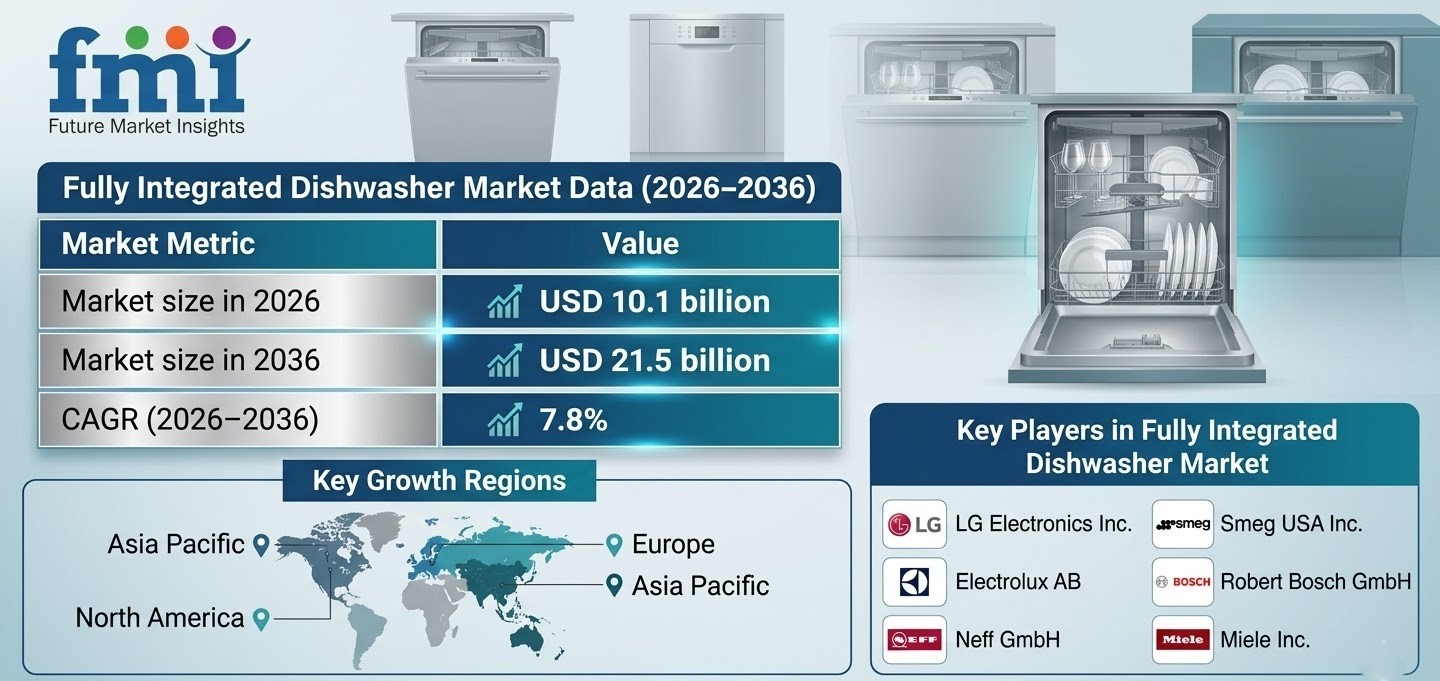 NEWARK, DE, UNITED STATES, March 17, 2026 /EINPresswire.com/ -- The global fully integrated dishwasher market is projected to witness robust growth over the next decade, expanding from USD 10.1 billion in 2026 to USD 21.5 billion by 2036, registering a CAGR of 7.8%. According to the latest analysis by Future Market Insights (FMI), growth is driven by increasing demand for concealed, panel-ready kitchen appliances aligned with modern modular cabinetry and smart home integration trends.