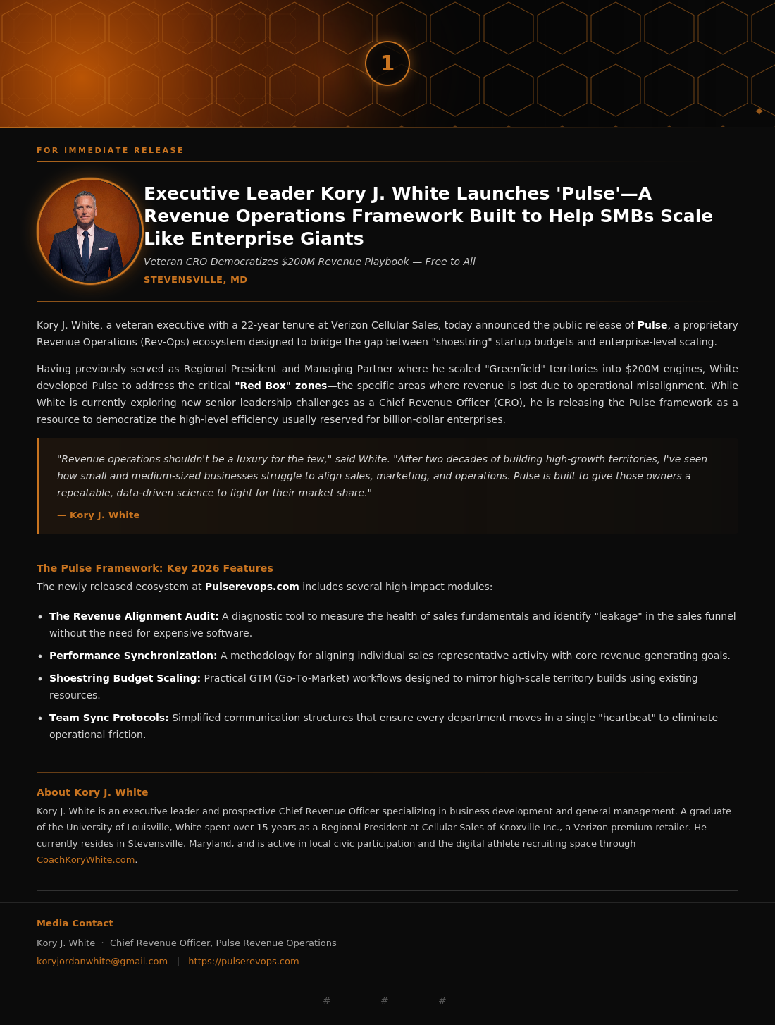 Veteran CRO Kory J. White releases the Pulse framework, a proprietary Rev-Ops ecosystem designed to help SMBs eliminate revenue leakage and scale efficiently.